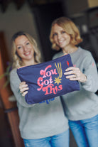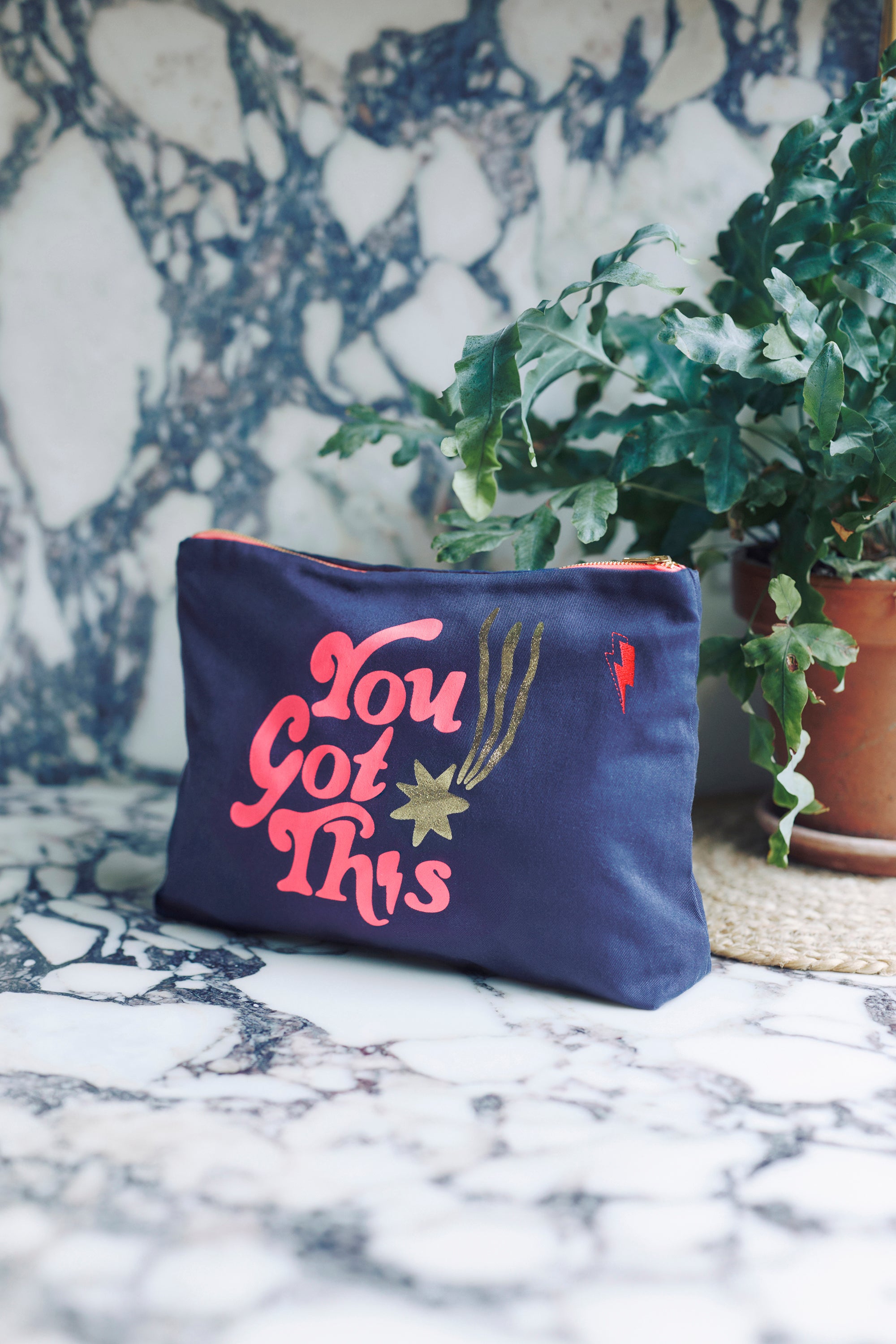Large navy swag bag with ‘You got this’ text and gold metallic star print