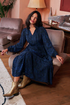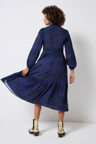 Navy Leopard Ray Blouson Sleeve Tie Front Midi Dress