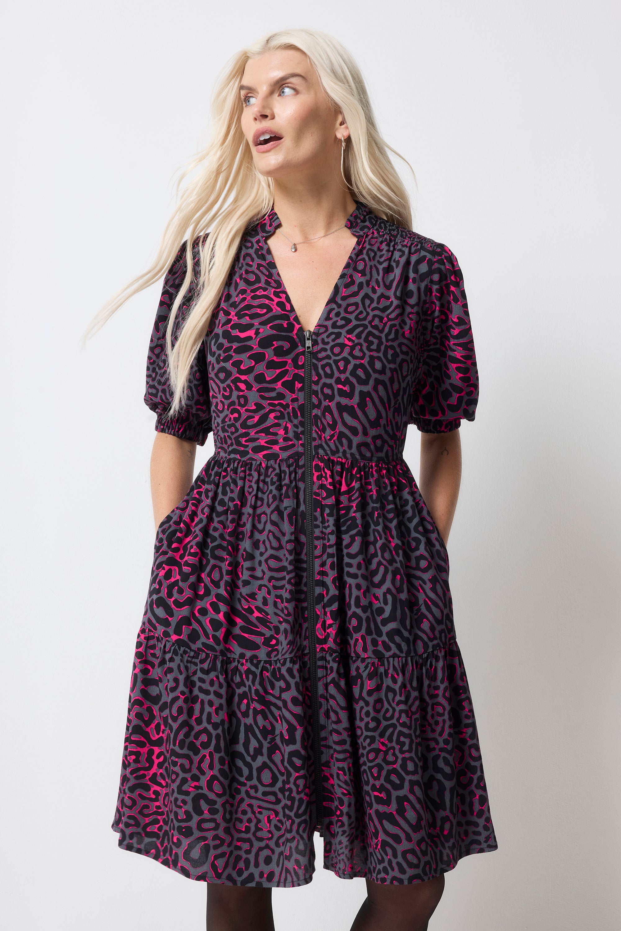 COMING SOON: Grey with Pink Leopard Ray Zip Detail Tiered Short Dress