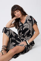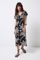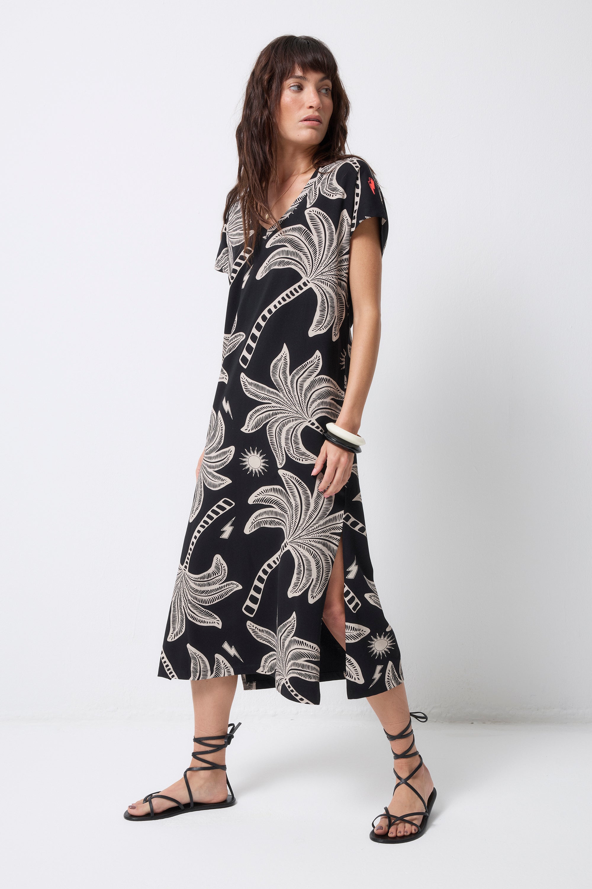 Black with Off White Palm Spring V-Neck Midi T-Shirt Dress