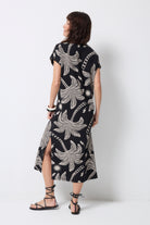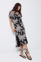 Our black with off white palm spring print midi oversized T-shirt dress was created with comfort and style in mind. Cut from super-soft organic cotton which is incredibly comfortable to wear and will keep you cool in warmer weather, it also features side splits which allow for extra movement and comfort. Wear with sandals or trainers and your favourite pair of sunglasses.