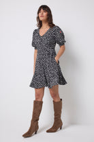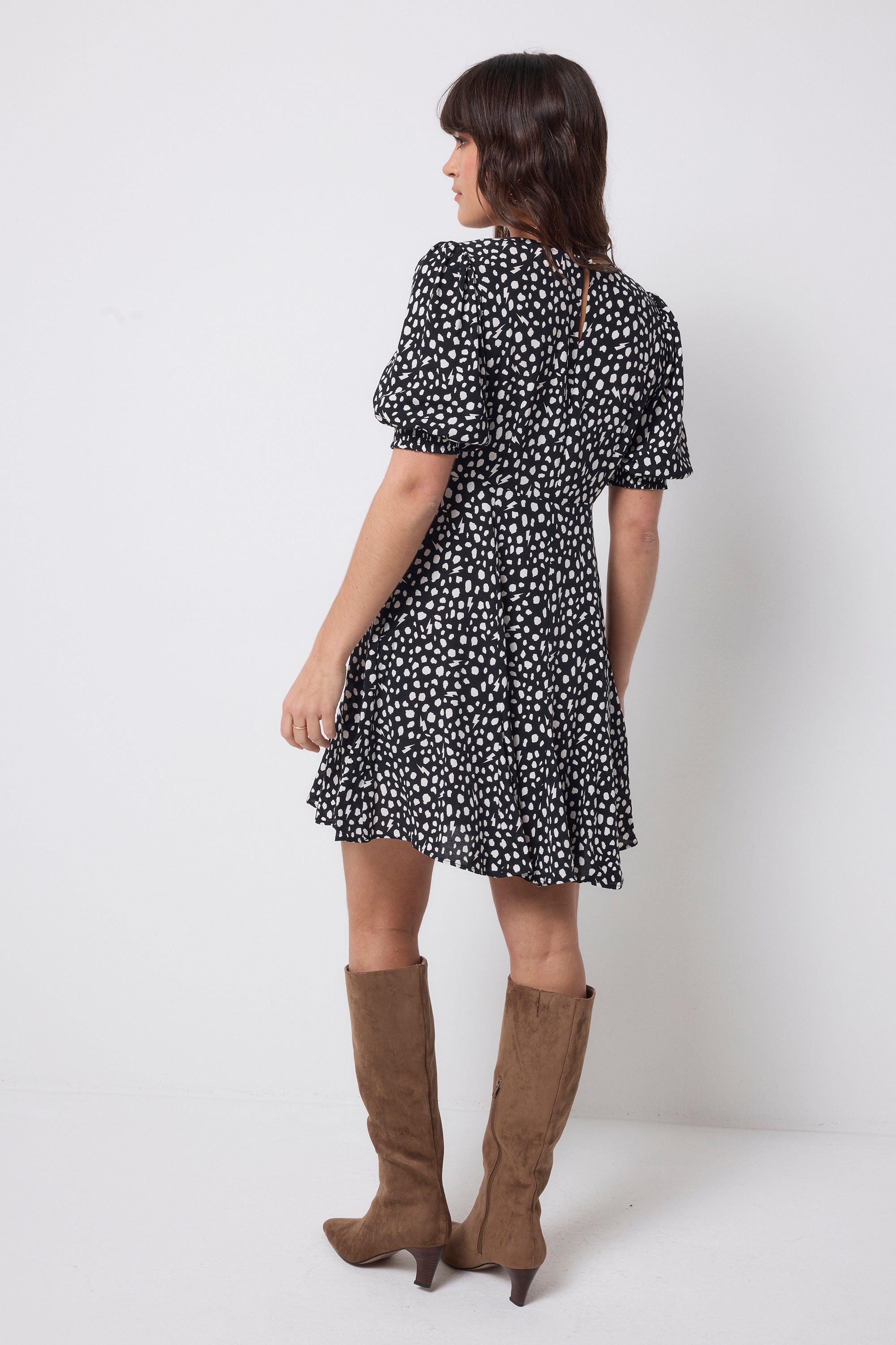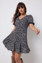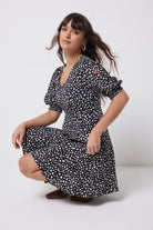 Feel confident in our black with white cheetah and lightning bolt short skater tea dress. Made in a soft viscose crepe fabric, this versatile short-length dress features a timeless V-neck and short sleeves.