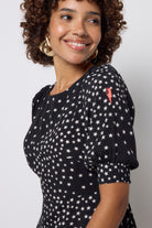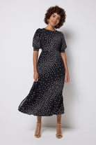 Bold and beautiful, this black with white star cluster print and lightning bolt midi dress will make a joyful addition to your wardrobe. Made in a soft viscose crepe fabric, the midi length dress features a universally flattering neckline and short angel sleeves.