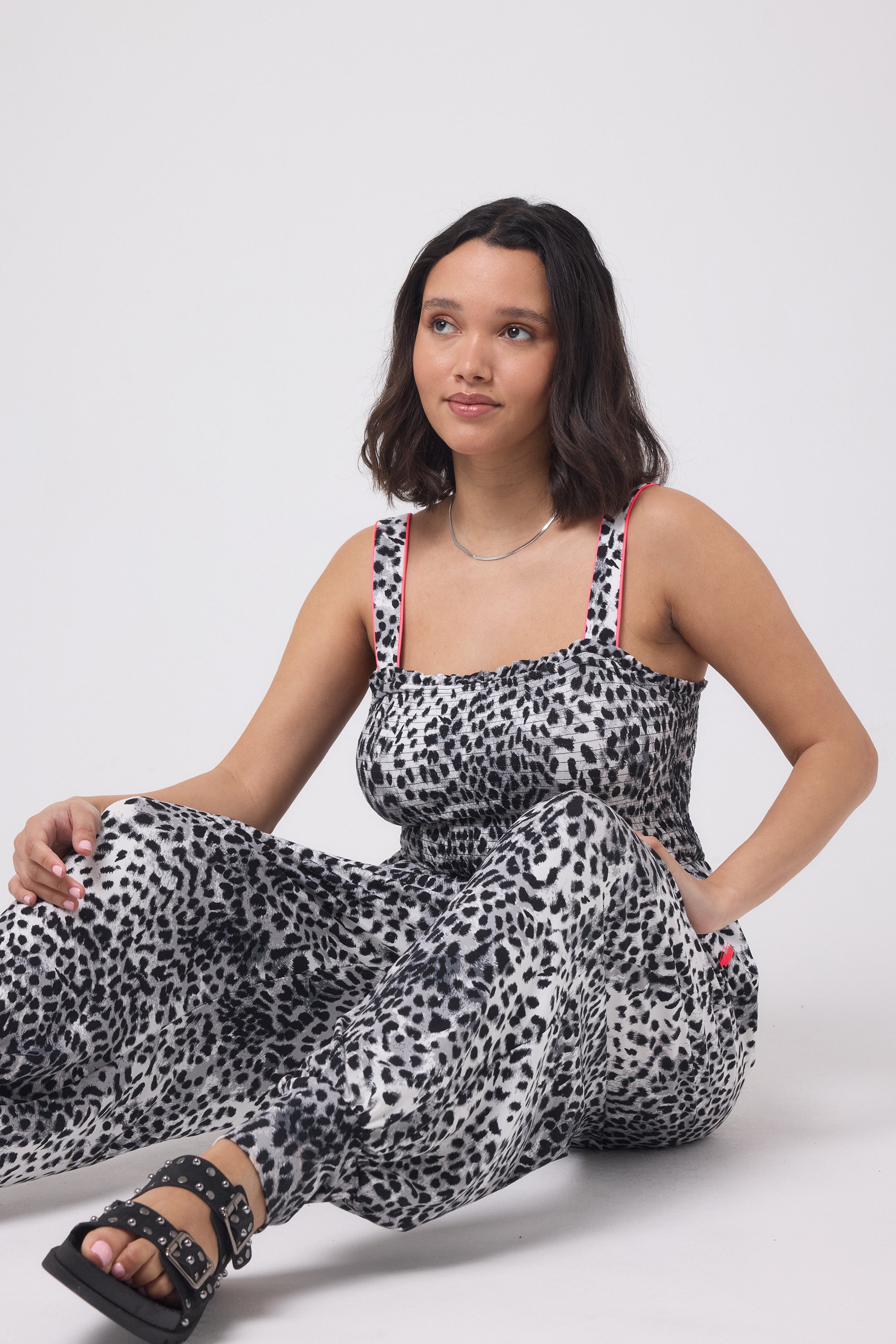 Our grey with black cheetah and lightning bolt jersey jumpsuit is super comfy, fuss-free and perfect for sun-soaked days. Style with a t-shirt underneath or pair with one of our jackets on cooler days.