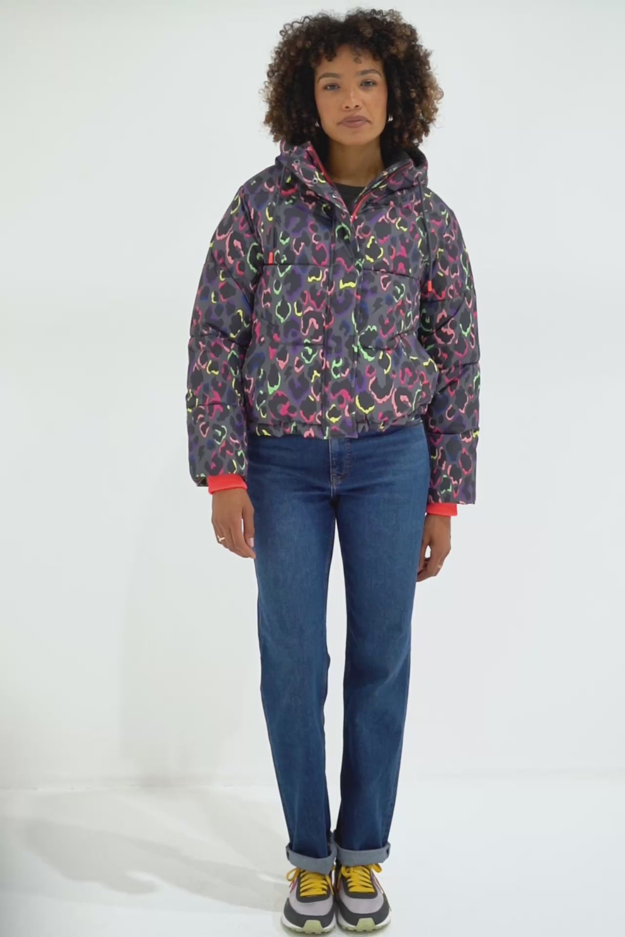 Cosy up in our rainbow leopard print puffer coat, your AW25 wardrobe staple. Designed with a shorter length, throw this on over anything from loungewear to jumpers and jeans or dresses.