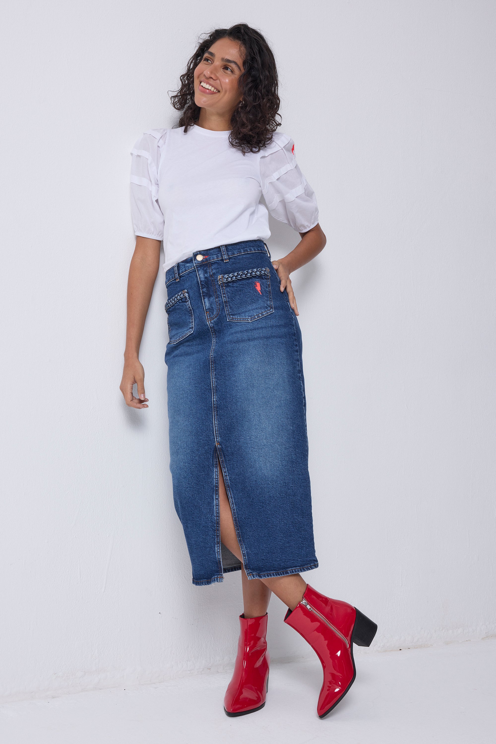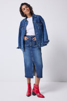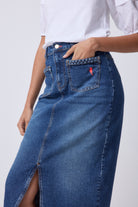 Giving your jeans the day off just got easier. This indigo denim split front maxi skirt has both structure and softness making it perfect for every day. With a maxi length and front split detail, you can make a statement with any day or evening outfit.