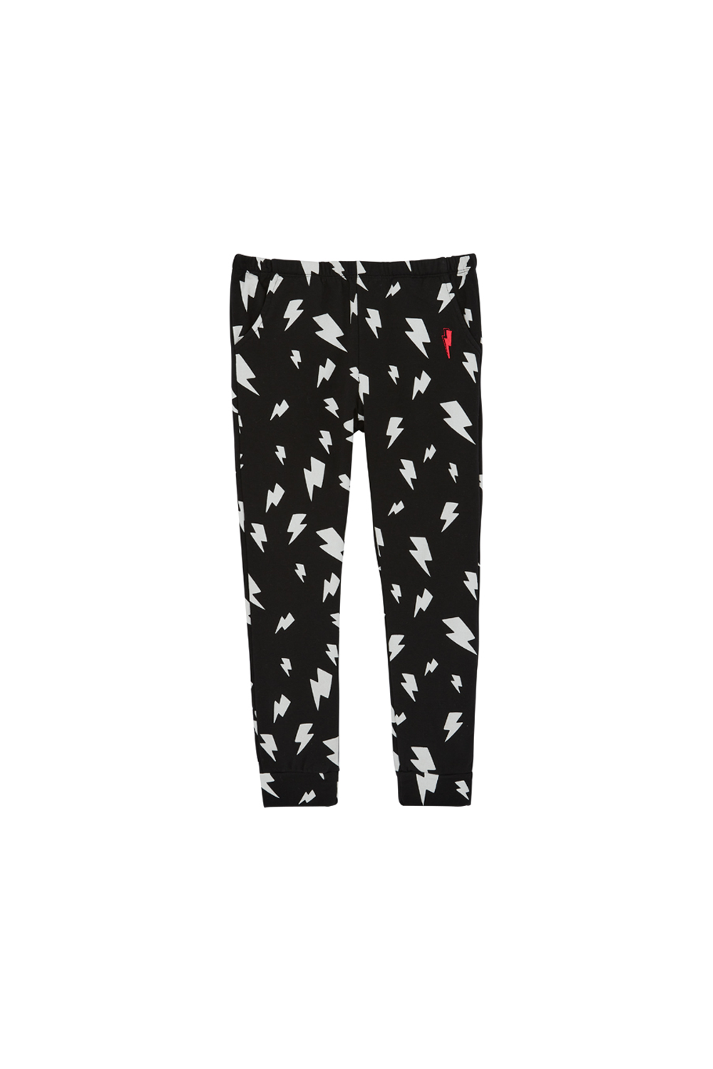 Black, cosy, unisex, super soft joggers with white lightning bolt print.