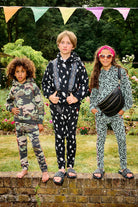 Khaki camouflage print, cosy, super soft joggers with signature neon outlines and piping at the side seam