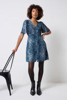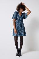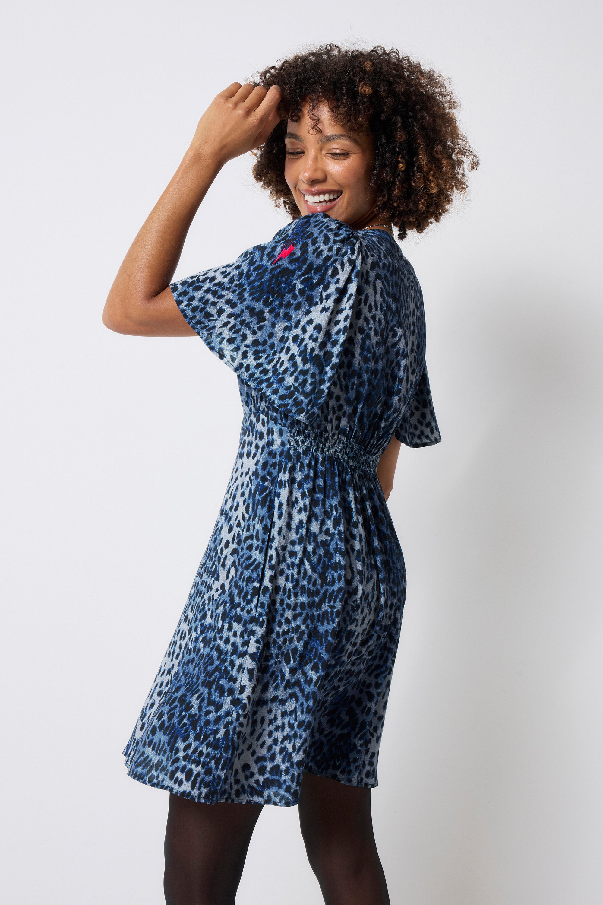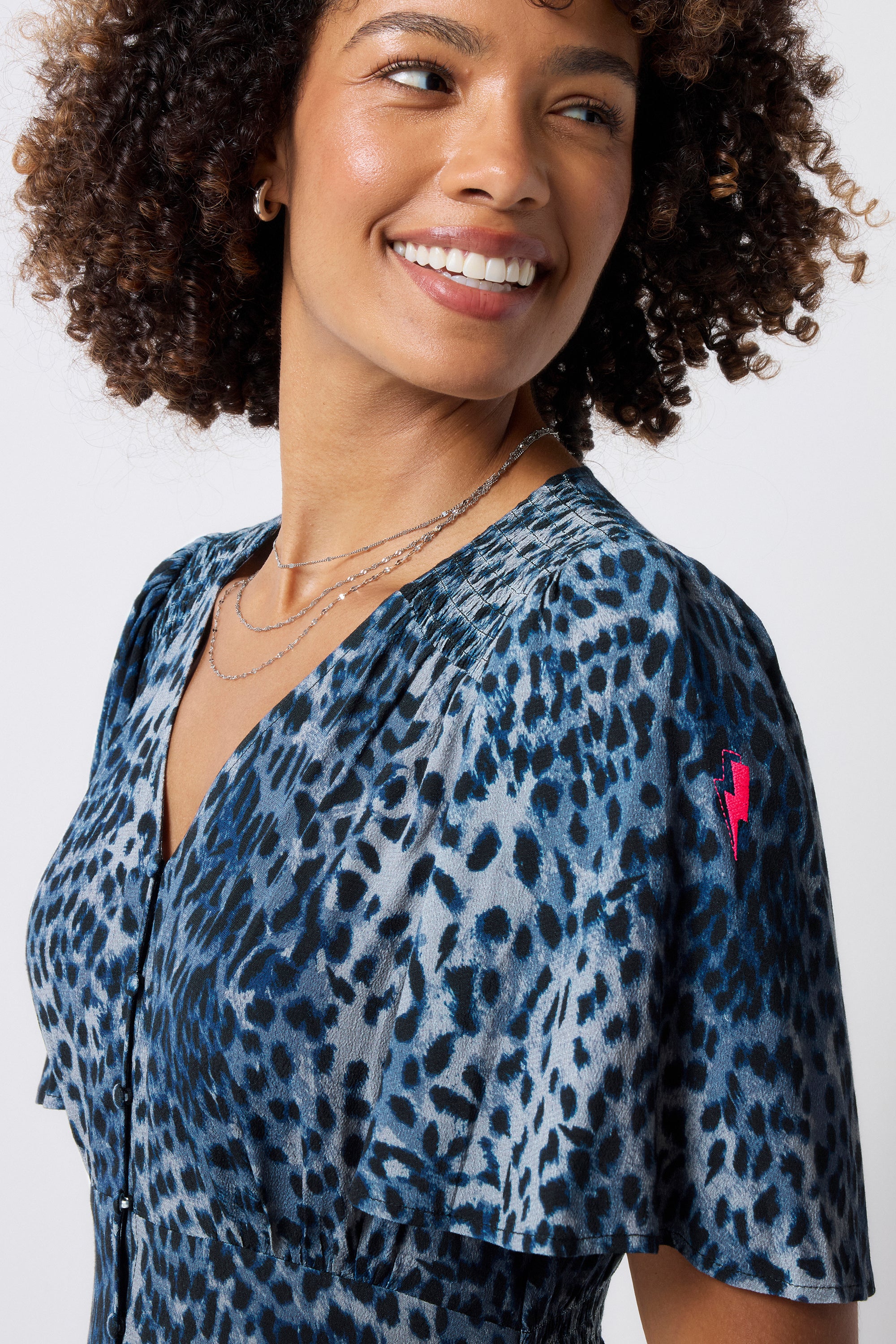Feel confident in our navy cheetah and lightning bolt button through short tea dress. Made in a soft viscose crepe fabric, this versatile short-length dress features a timeless V-neck and short angel sleeves.