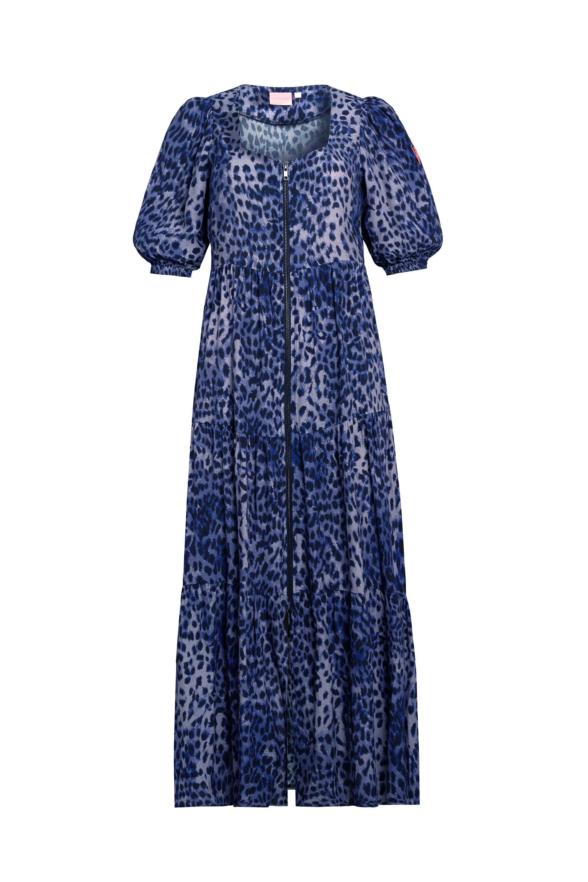 Navy Cheetah Square Neck Zip Detail Tiered Midi Dress