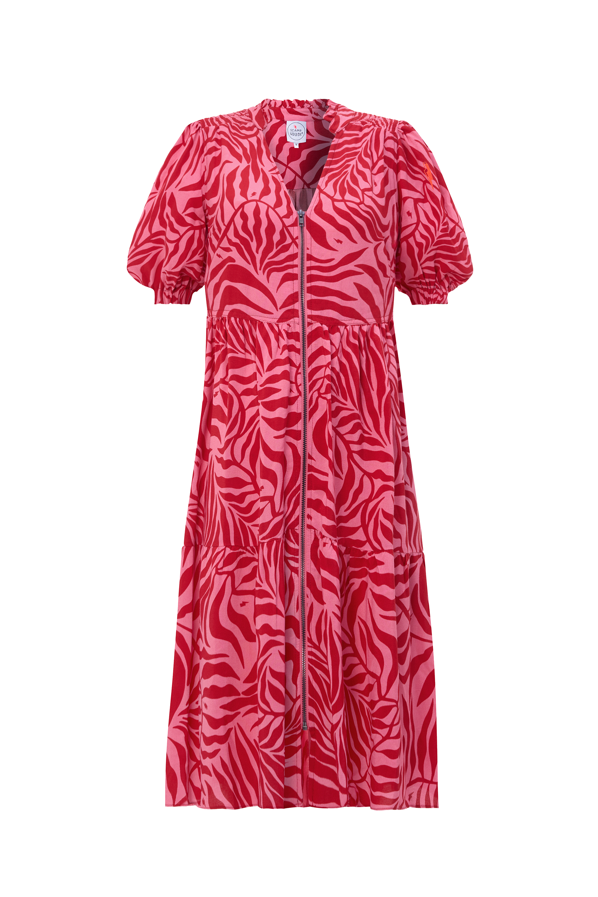 Pink and Red Palm Zip Detail Tiered Short Dress