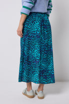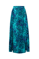 Spruce up your skirts collection with this turquoise with blue cheetah and lightning bolt print split front skirt. This statement making piece can be amped up for special occasions or dressed down easily. It's designed with an elasticated waist on the back for easy comfort.