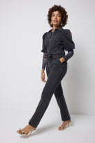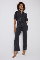 Your weekend wardrobe is calling out for our dreamy washed black denim flared leg jumpsuit. This hero piece is fitted at the top and slim through the hip with a flared leg. The effortless all-in-one jumpsuit takes the drama out of getting dressed. Styling couldn't be simpler - just add jewellery and a pair of trainers, cowboy boots for a western look, or opt for a pair of clogs for a 70s inspired look.